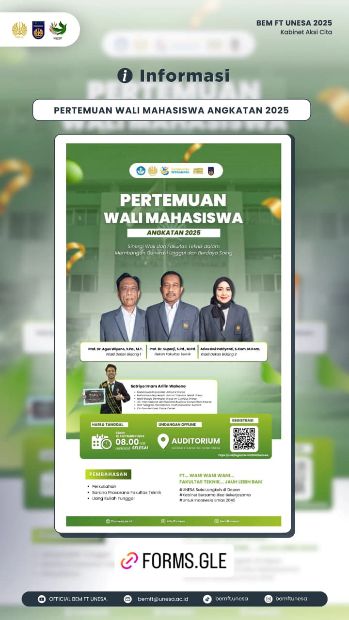 Peran Orang Tua Mahasiswa dalam Membangun Generasi UnggulFT UNESA 2025 - Pertemuan Wali Mahasiswa Angkatan 2025Pada tanggal 15 September 2025, bertempat di Auditorium UNESA, telah berlangsung a